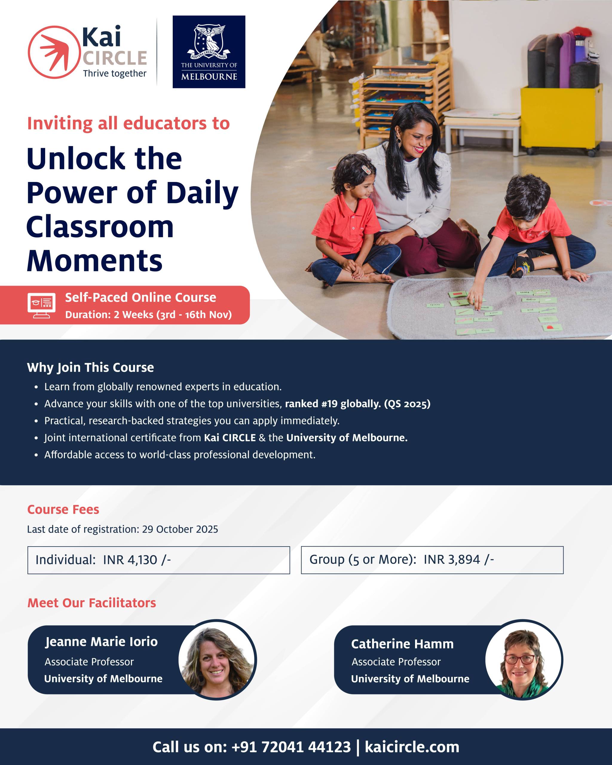 We are a dynamic learning and professional development ecosystem rooted in child development science and committed to educator wellbeing. Whether you are beginning your teaching journey, seeking international certification, or looking to deepen your impact through coaching, research, or peer learning, Kai CIRCLE is your place to grow.